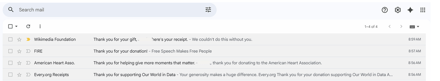 It feels a little weird to write about annual charity donations in public but this has been a year of feeling a little weird anyways so I’ll roll with it. I asked Squirt if he knew who I would be donating to and, unsurprisingly, he immediately answered with Wikipedia (a site I send him to constantly) but here’s the whole list…