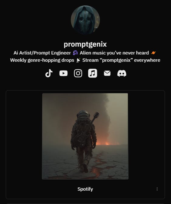 So I’m currently grooving to this band I wrote about a couple weeks ago where I wondered if it’s AI. Since then I’ve gotten confirmation that it is absolutely some flavor of AI generation. Spouse found them on TikTok and then a Linktree. It is quality blues music from an “Ai Artist/Prompt Engineer” filled with weird alien planet references and science fiction vibes.