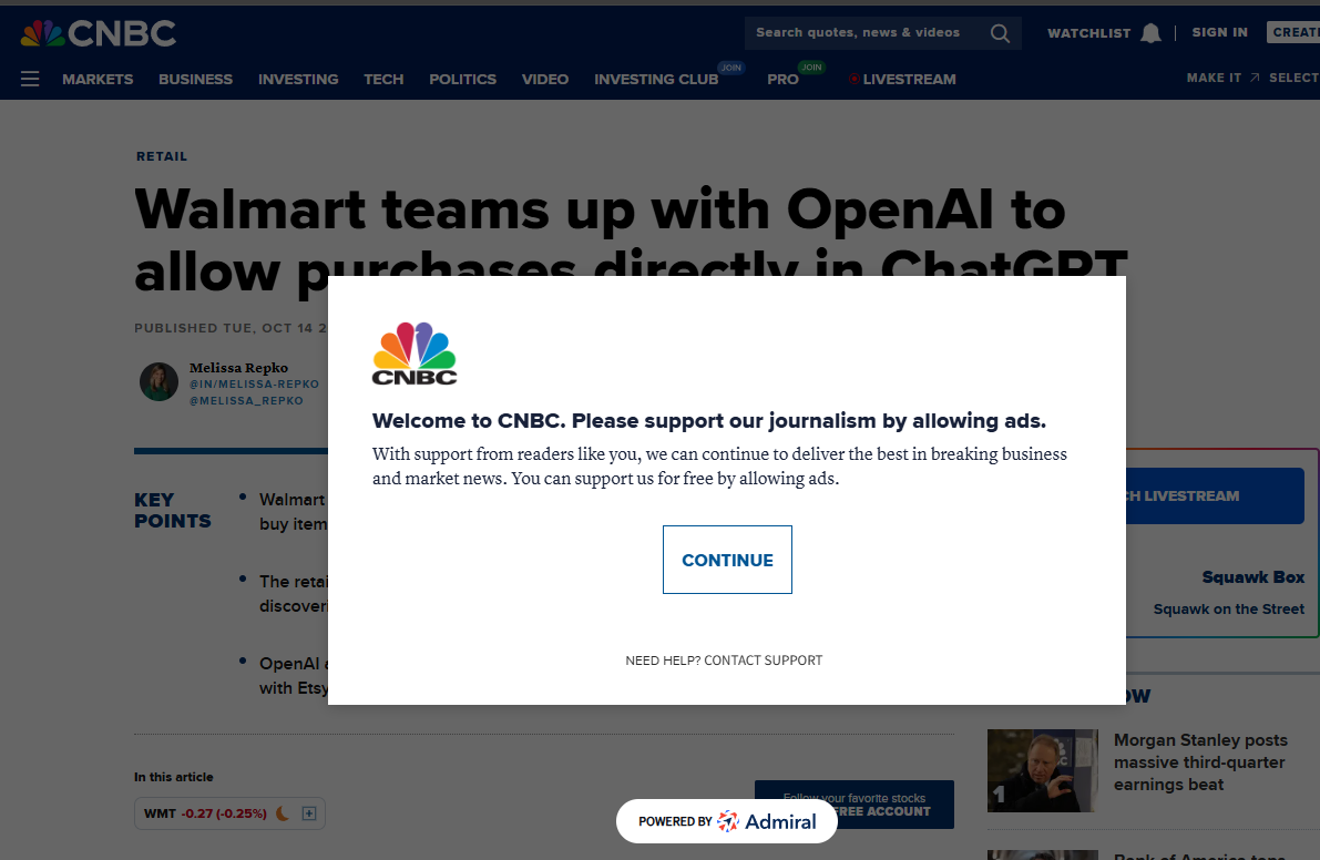 Yesterday it was announced that Walmart is going to team up with OpenAI and Walmart’s stock surged. When I followed that link I was met with the following pop-up from CNBC: