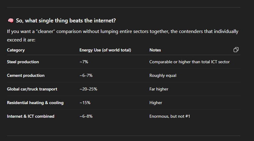 That line up there where I said the internet is “one of largest consumers of energy in the world” - originally I wrote that as “the single largest consumer of energy in the world.” And then I took that statement to ChatGPT and asked it if it was true because I wasn’t really sure. I do this frequently, turning my free ChatGPT service into a research assistant. In this case it resulted in my rewriting my statement because I was flat wrong.