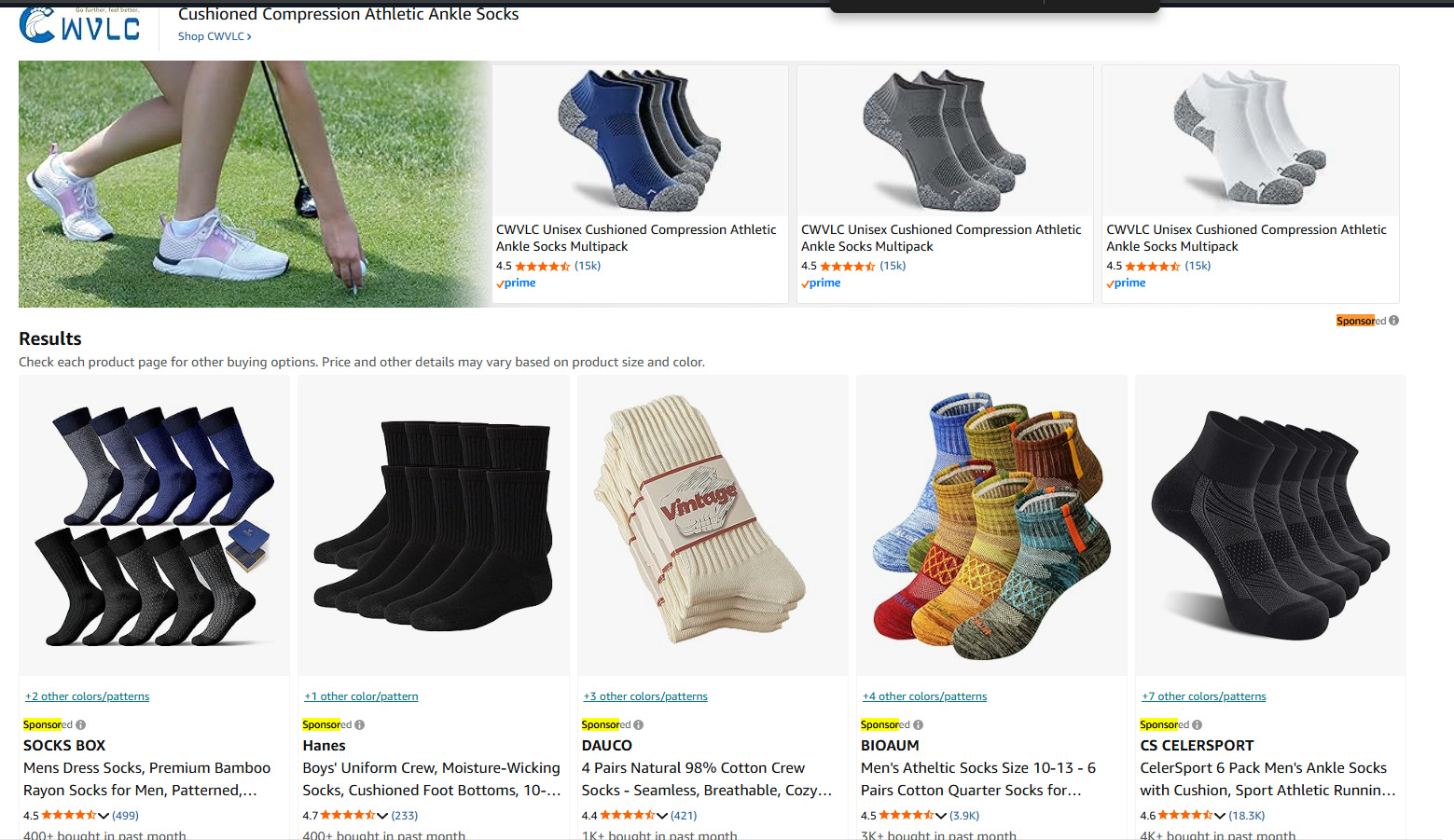 The search results aren’t even on the fucking page. It’s just advertisements! Advertisements that, if I click them, will result in Google getting paid some piddling amount of money. Here’s a search on Amazon for socks with the word “sponsored” showing up six times.