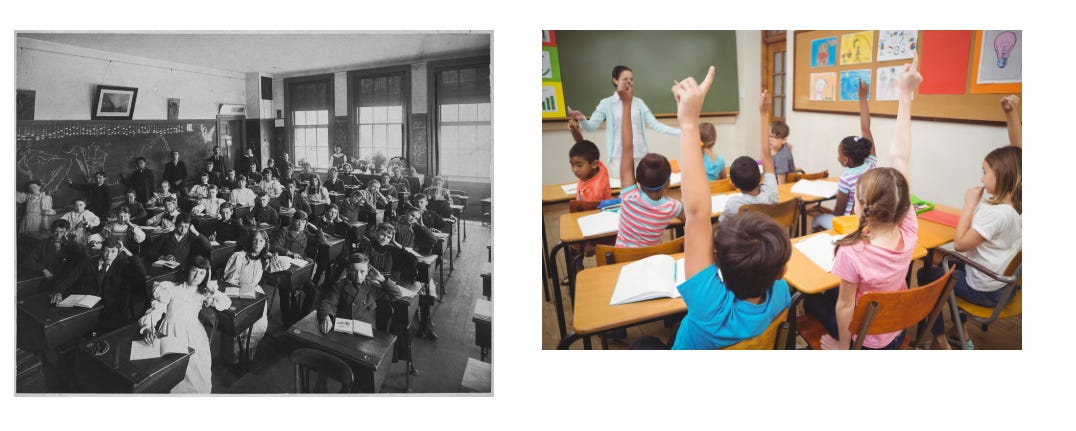 Other parts of the world have grown and evolved but schools…not so much. It’s still kids sitting in a room being talked at by a teacher. Now there are some modern tools, like laptops you can take home and software that learns with you but, at its heart there hasn’t been anything like the same changes as the hansom cab to the Mustang.
