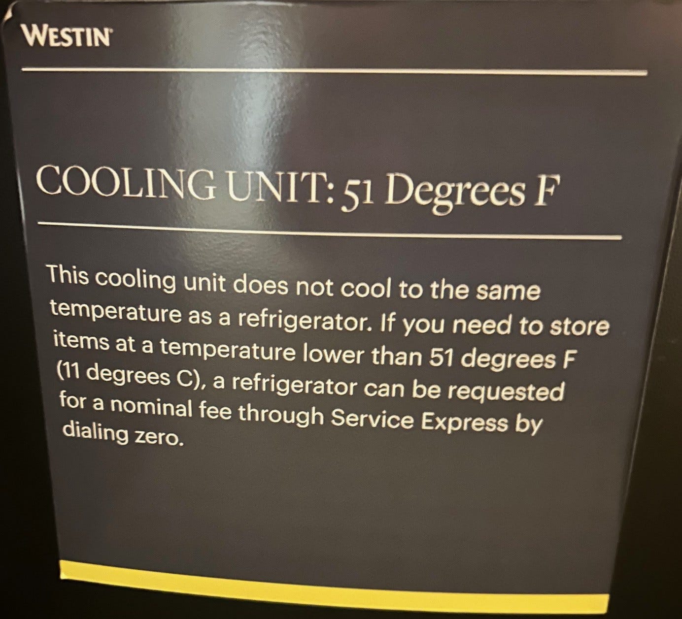Because nothing says expensive hotel like not giving you a refrigerator. It’s part of The Experience(tm). Why would you ever do something as common as saving leftovers or buying a meal that you can split in half from your favorite Big City restaurant. Oh, wait…you just did that? Are you sure you’re in the right place? Here we order room service for every meal…make sure you tip well too.